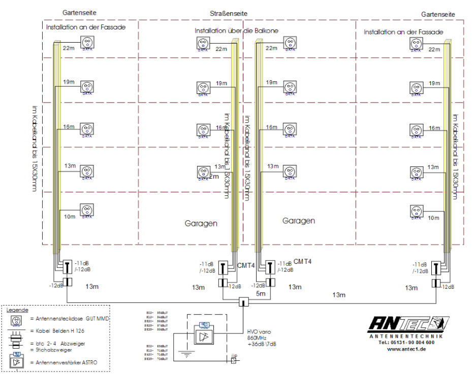Installationsplan einer sternförmigen Kabelfernsehverteilung.